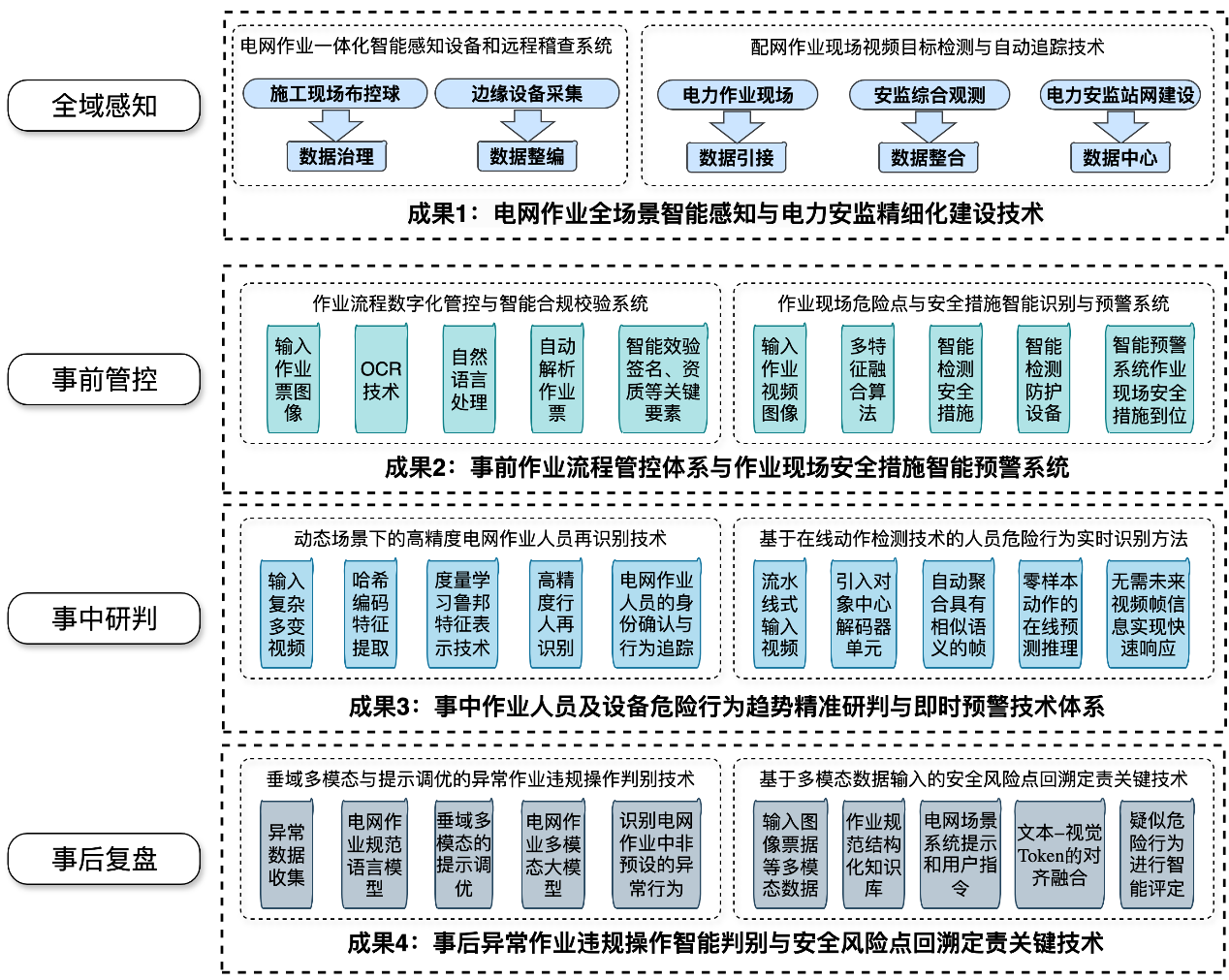 电力系统作为国家能源安全的核心基础设施,其安全生产直接关系到社会稳定与经济发展。然而,在传统的电力安全监管中,长期面临着人工巡检效率低下、复杂环境风险预判能力弱、隐患排查滞后以及事后处置被动等诸多“卡脖子”难题。面对这些迫切的行业痛点,联合攻关团队迎难而上,聚焦国家重大战略需求,系统性地构建了“全域感知-事前管控-事中研判-事后复盘”的全链条电力作业安全风险智能监测与防控体系。经过长期的理论探索与无数次技术迭代,团队在核心算法与系统架构上取得了四项重大科技创新突破: