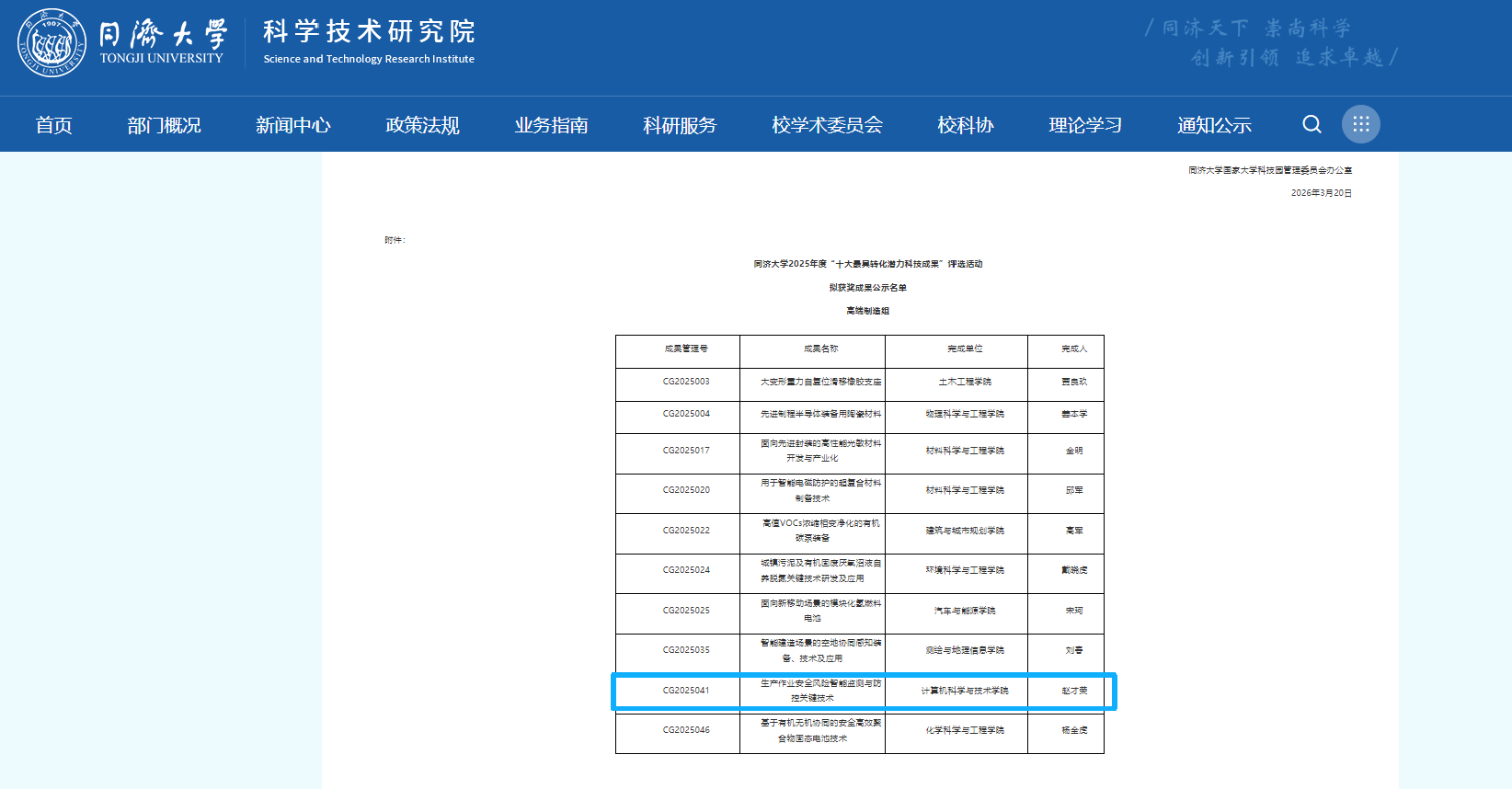 近日,同济大学科学技术研究院发布了同济大学2025年度“十大最具转化潜力科技成果”评选活动拟获奖成果公示名单。其中,由赵才荣教授团队申报的成果——“生产作业安全风险智能监测与防控关键技术”成功入选同济大学2025年度“十大最具转化潜力科技成果”(高端制造组)。