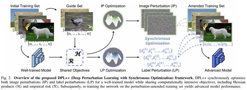在该工作中,我们提出了一种名为DPL++的新型训练范式,通过同步优化图像扰动(IP)和标签扰动(LP)来提升深度学习模型的泛化能力。具体而言,我们构建了一个可微分的优化目标,并设计了高效的交替优化策略,迭代优化模型权重、图像扰动及标签扰动;通过在7个基准数据集和15种骨干网络上的大量实验,证实了DPL++在图像分类、目标检测和语义分割等任务中均能持续提升模型性能;相较于之前的DPL方法,DPL++实现了视觉-语义的整体优化,借助共享计算中间结果(如Hessian乘积)实现了协同效率提升,减少了优化迭代次数,同时通过扩展的实证验证和深入分析,揭示了其在决策能力、风险最小化、类别区分度等方面的优势,且可与现有数据增强、知识蒸馏等技术灵活结合,为监督学习提供了一种通用且高效的解决方案。