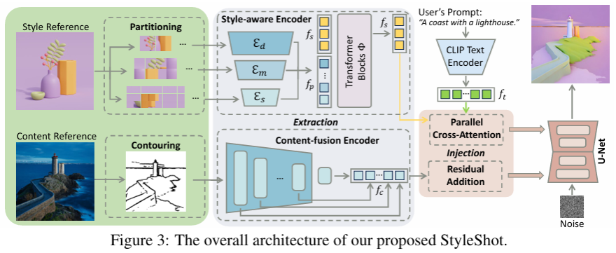 在该工作中,我们提出了一种名为 StyleShot 的通用风格迁移方法,能够在无需测试时微调的情况下,将任意艺术风格高质量地迁移到任意内容图像上。具体而言,StyleShot 的核心在于构建一个风格感知编码器(style-aware encoder),该编码器能够从参考风格图像中提取出通用且判别性强的风格表征;同时,我们构建了一个结构化的风格数据集 StyleGallery,涵盖 3D、扁平化、抽象乃至细粒度等多种风格类型,用于训练和评估模型的泛化能力。大量实验表明,StyleShot 在图像质量、风格保真度和内容结构保持方面显著优于现有方法,且支持文本或图像双重驱动的风格迁移。该方法简单高效,为通用风格迁移提供了一种无需针对每张图像单独优化的端到端解决方案。